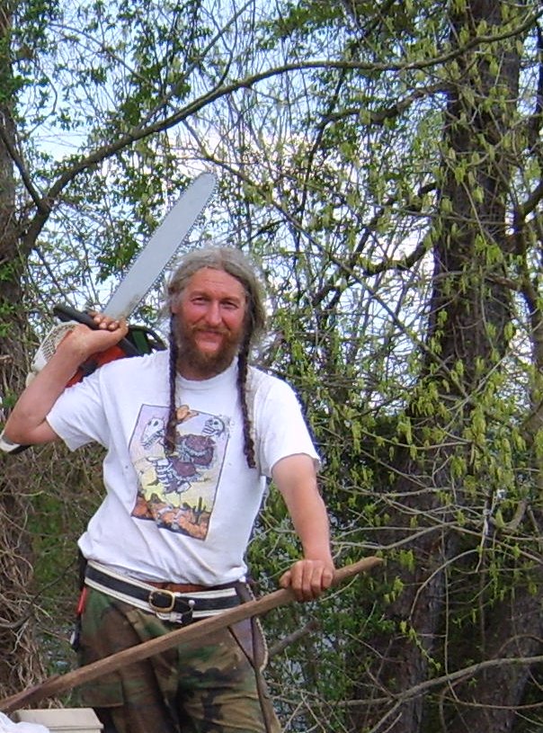 Eustace Conway with a sawThis is the ironic thing about living in the Home of the Free and land of the Brave as we no longer enjoy those freedoms. There should be no code or permit required on private property. If someone wants to build something let it be. When you go to sell it then you should have it brought to the acceptable levels of the buyer. If I am a paying customer and want to pay to stay in one of Eustace’s buildings the fact that the county has blessed it means nothing to me.